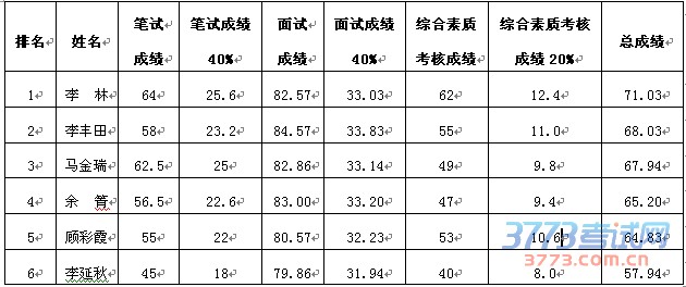 根据《青海省气象局2016年度财会专业毕业生公开招聘工作方案》,青海省气象局2016年度公开招聘财会专业毕业生笔试、面试工作已结束。现将笔试、面试及综合素质考核共三项总成绩排名公告如下: