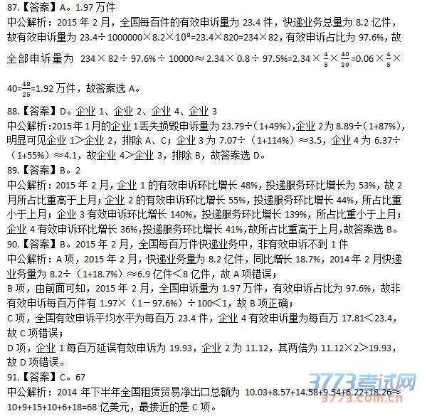 中公解析:2015年2月,快递业务收入为136亿元,业务总量为8.2亿件,每件的平均收入为136÷8.2<136÷8=17元,故答案选A。