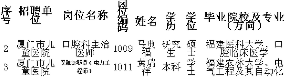根据《厦门市儿童医院2016年春季补充编内工作人员招聘简章》的有关规定,经笔试、面试、体检和考核程序,拟聘用马典福等贰名考生为我市市属医疗卫生事业单位编外工作人员。现将拟聘用人员名单予以公示。