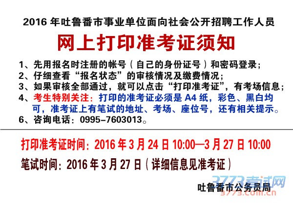 新疆吐鲁番市事业单位2016招聘网上打印准考证时间