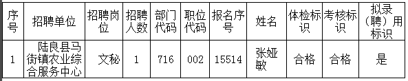 根据《关于对怀孕考生参加体检有关问题的复函》(国公考录函﹝2009﹞07号)和《陆良县2015年委托公开招聘事业单位工作人员实施方案》的规定,报考陆良县马街镇农业综合服务中心的张娅敏同志,经报名、资格审查、笔试、资格复查、体检、考核等程序,因怀孕延期体检暂缓录用。现孕期已经结束本人申请体检,且体检、考核合格,现将延期体检人员体检、考核结果及拟录(聘)用情况予以公示。