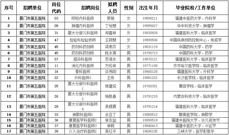 根据《厦门市事业单位补充工作人员暂行规定》的文件精神,厦门市第五医院补充编内工作人员考试(2015年9月)的公开招聘,通过笔试、面试、体检、考核等程序,现将厦门市第五医院部分拟聘用人员公示如下: