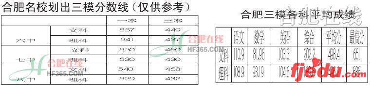 合肥市三模的成绩已经揭晓,合肥市教育局没有公布此次考试的模拟分数线,但合肥市省示范高中都根据学生成绩划出了模拟分数线,本报特搜集了合肥六中、七中、八中三所学校划出的一本和三本的分数线,制成表格,以供参考。
