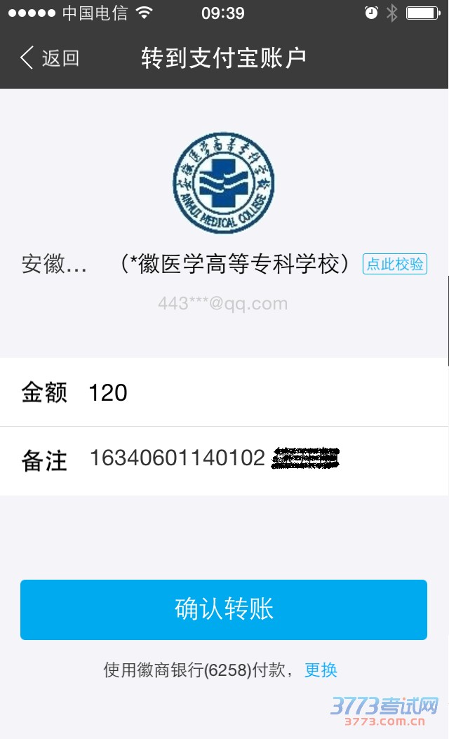 答:确认信息后,打开支付宝扫一扫(图1),金额120元,一定要在备注中输入准考证号码和姓名(图2),确认缴费。