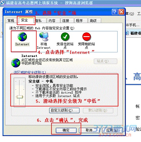 然后考生应该检查所使用的浏览器,强烈建议使用IE浏览器或Maxthon(遨游)浏览器并且要在IE浏览器的安全设置中将Internt安全设置成中或中高(如下图所示:) ,。