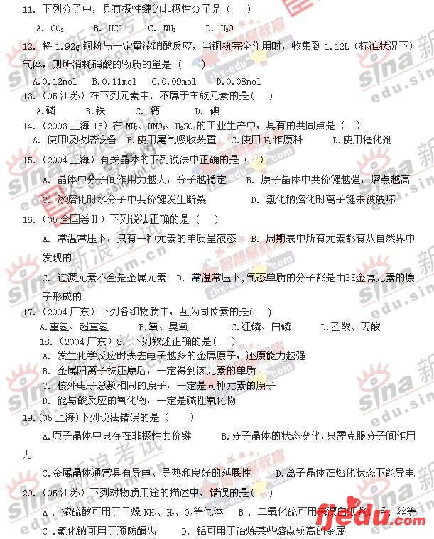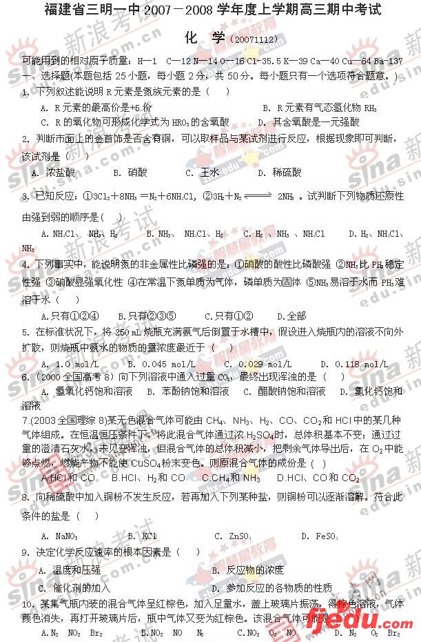 福建省三明一中2008届高三上学期期中考试化学模拟试卷