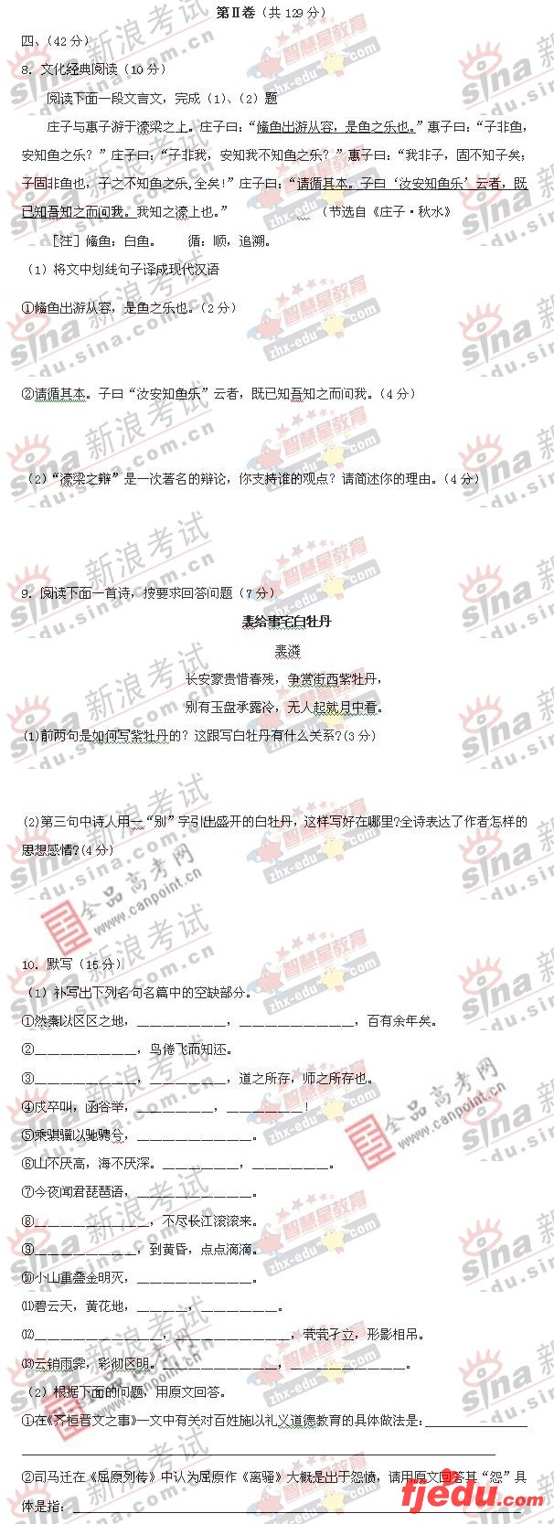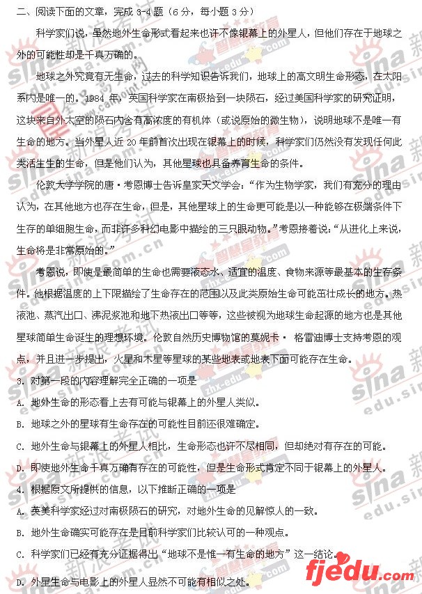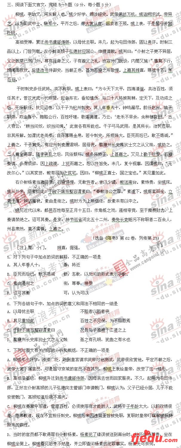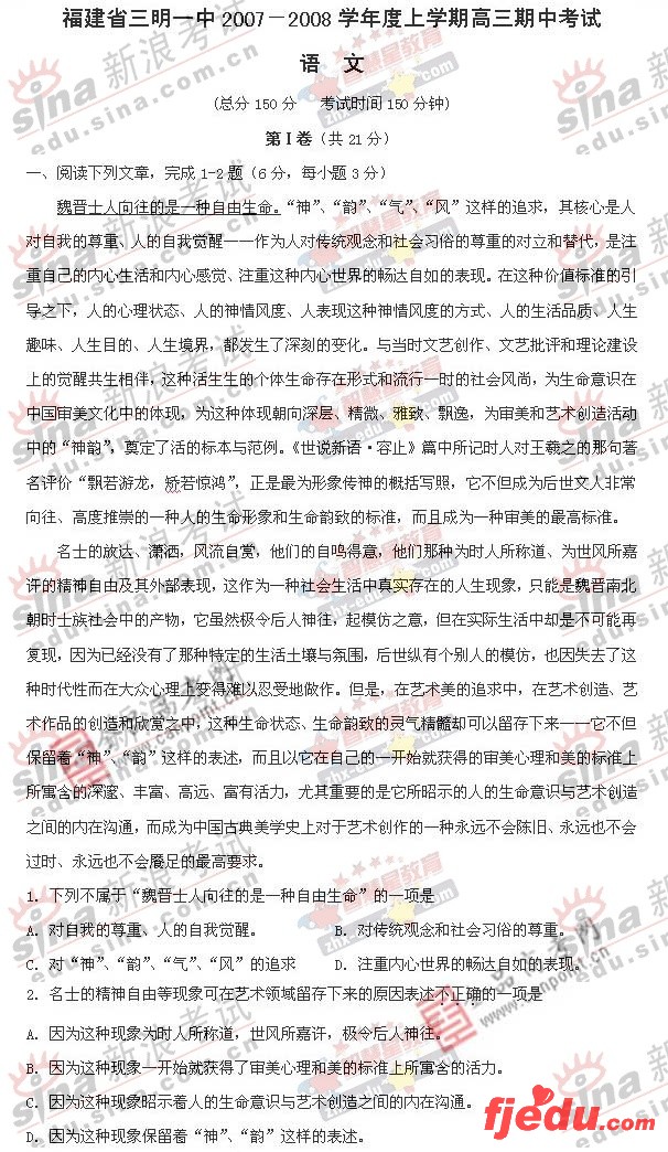 福建省三明一中2008届高三上学期期中考试语文模拟试卷