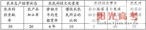 38.(32分)(1)反映该县的农业科技贡献率低、农业产业化程度低;农民科技文化素质不高;农村社会保障基础差;村委会建设有待提高。(4分)总体要求是按照“生产发展、生活宽裕、乡风文明、村容整洁、管理民主”目标,全面加强社会主义新农村建设。(2分)