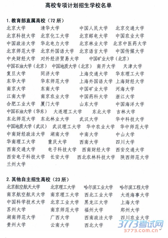 按照自主招生办法,高校专项计划只公布招生院校名称和院校代码。