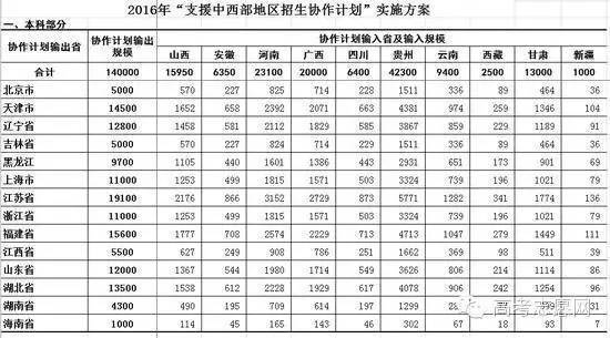 《通知》提出要促进高等教育区域和城乡入学机会公平。2016年,支援中西部地区招生协作计划安排21万人,其中本科14万人,由北京、天津、江苏等14个省(市)的公办普通高校承担,面向河南、广西、贵州、甘肃等10个中西部省(区)招生。国家贫困地区定向招生专项计划安排6万人,由中央部门和地方 “211工程”学校为主的本科一批招生高校承担。地方重点高校招收农村学生专项计划由各省(区、市)在本科一批招生的本地省属高校承担,招生计划原则上不少于有关高校本科一批招生规模的3%。重点高校农村学生单独招生计划由教育部直属高校和其他自主招生试点高校承担,招生计划不低于有关高校年度本科招生规模的2%。高等教育资源丰富、2016年升学压力较小的上海、江苏、浙江、福建等省(市),应在上年常规跨省生源计划和2016年协作计划的基础上,进一步增加面向部分中西部省(区)的生源计划。