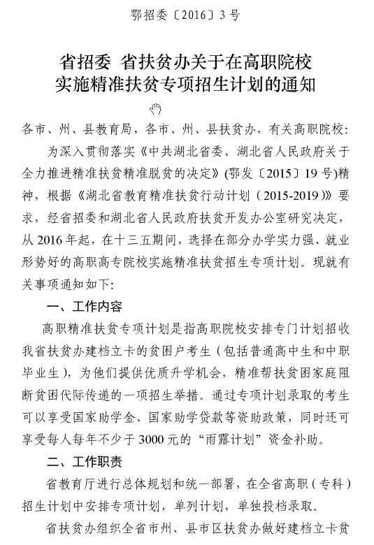 湖北省招办在高职院校实施精准扶贫专项招生计划