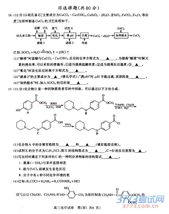 2016乌鲁木齐二模民语系化学答案及评分标准