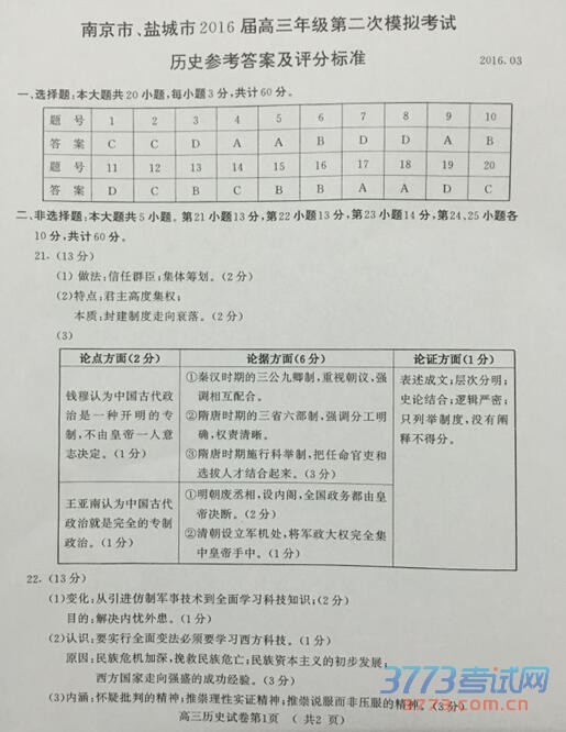 2016南京一模盐城一模历史试题及答案