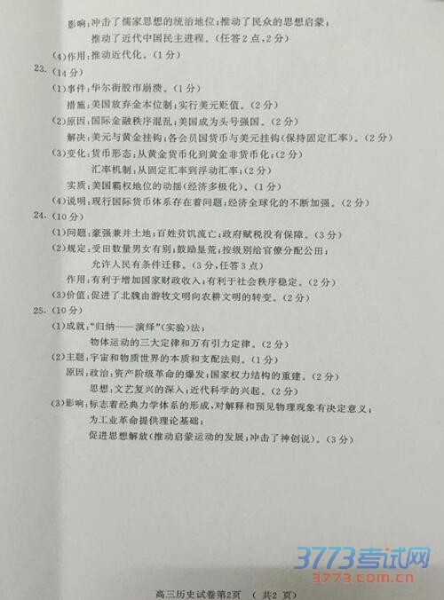 2016郑州一模历史答案评分标准