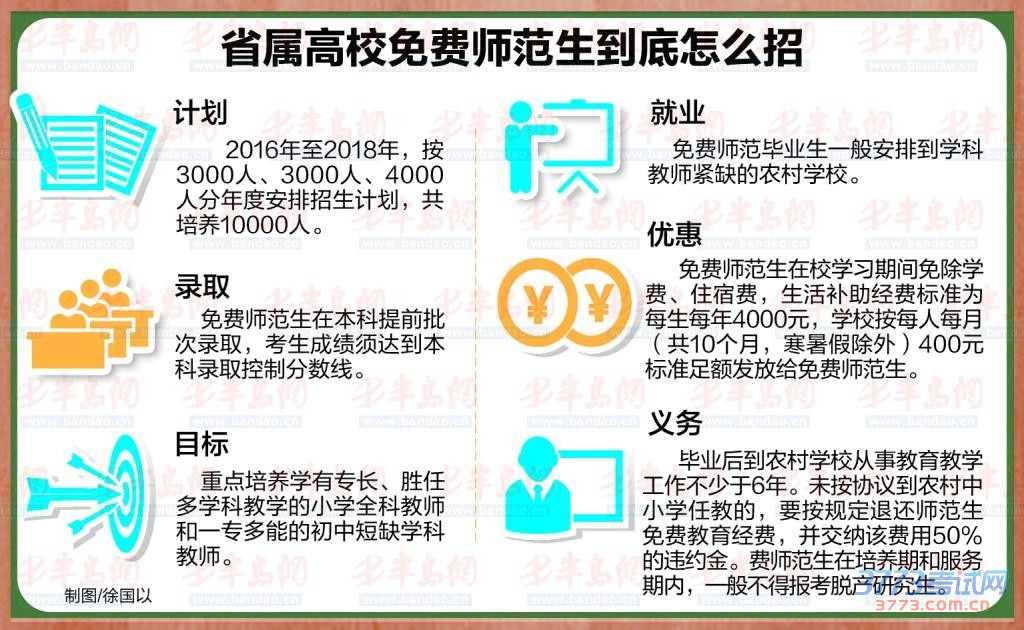 免费师范生享受什么样的优惠?省教育厅规定,免费师范生在校学习期间免除学费、住宿费,并给予一定的生活补助。所需经费由省财政按每生每年10000元的标准拨付高校。其中生活补助经费标准为每生每年4000元,学校按每人每月(共10个月,寒暑假除外)400元标准足额发放给免费师范生。