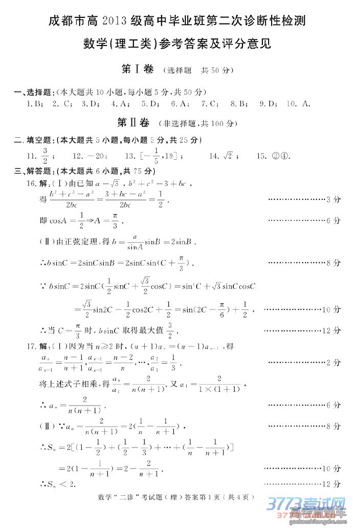 2016自贡二诊文科数学答案评分标准免费