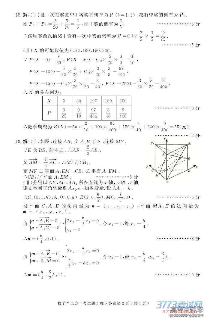 2016乌鲁木齐二模数学理科答案及评分标