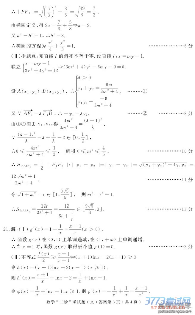 2016自贡二诊文科数学答案评分标准免费