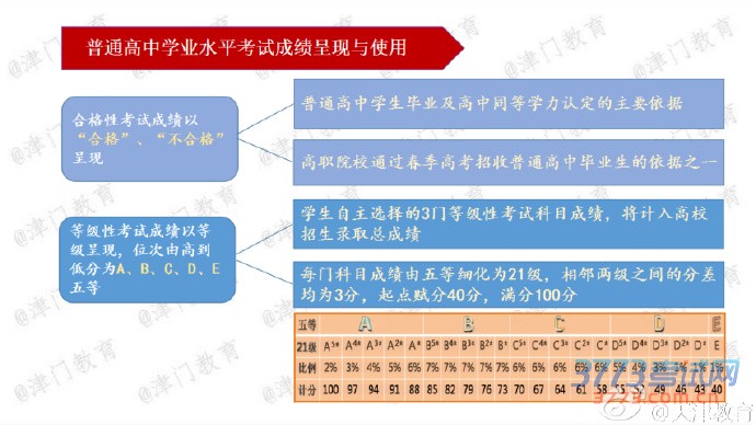 成绩呈现与使用:合格性考试成绩以“合格”、“不合格”呈现。合格性考试科目成绩合格是普通高中学生毕业及高中同等学力认定的主要依据。等级性考试成绩以等级呈现,位次由高到低分为A、B、C、D、E五等。学生自主选择的3门等级性考试科目成绩,将计入高校招生录取总成绩。在计入录取总成绩时,每门科目成绩由五等细化为21级,相邻两级之间的分差均为3分,起点赋分40分,满分100分。