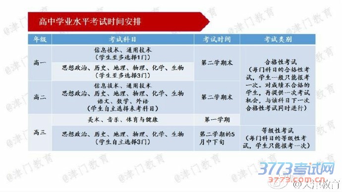 关于考试科目与内容:合格性考试内容以国家发布的普通高中课程标准中必修课程的规定及要求为依据,共设置14门科目(语数外、理化生、史地政、音体美、信息技术与通用技术),引导学生认真学习每门必修课程,避免严重偏科。等级性考试内容以国家发布的普通高中课程标准中的必修和选修课程的规定及要求为依据。学生在完成必修内容的学习,对自己的兴趣和优势有一定了解后,根据自身爱好与特长及所要报考高校的要求,在思想政治、历史、地理、物理、化学、生物6门科目中自主选择3门作为等级性考试科目。