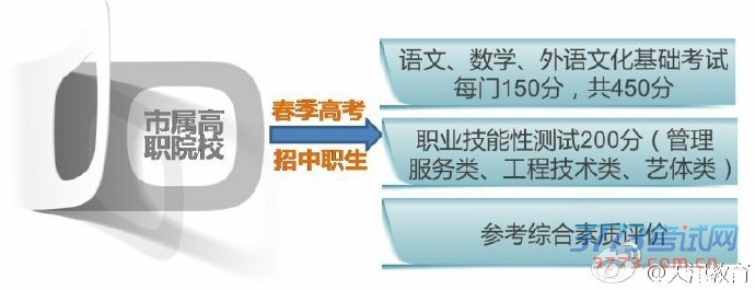 高职院校通过春季高考招收中职学校毕业生,依据文化基础与职业技能相结合的测试成绩进行录取,测试实行全市统一命题、统一组考、统一评卷。其中,文化基础考试科目保持不变,仍为语文、数学、外语;职业技能考试由现行的统一类别细分为工程技术类、管理服务类和艺术体育类,学生可自主选报1个职业技能类别。