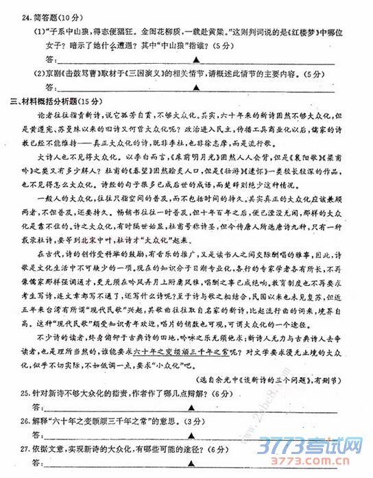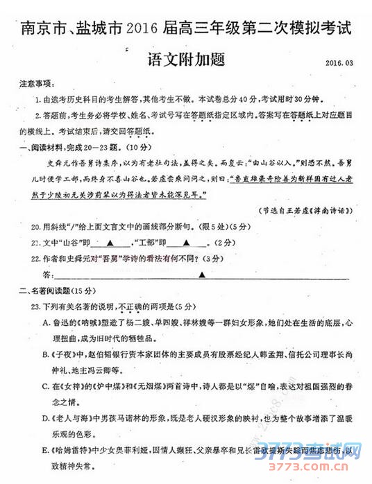2016乌鲁木齐二模汉语试题答案及评分标准