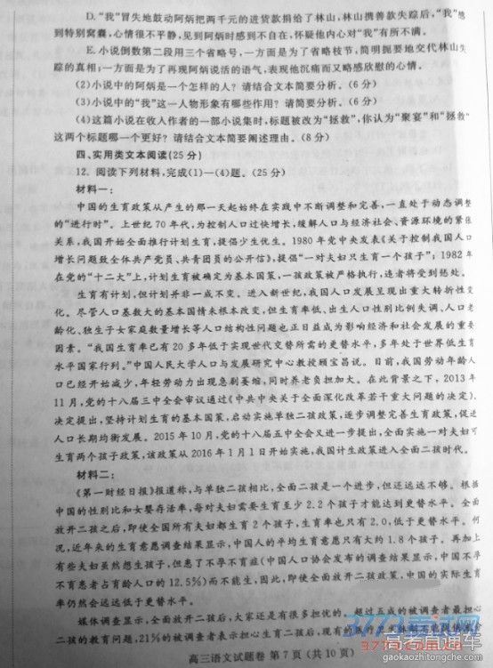 2016自贡二诊语文试题答案评分标准免费