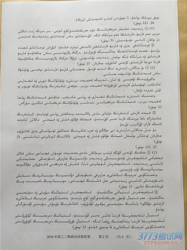 2016乌鲁木齐二模民语系政治答案及评分标准