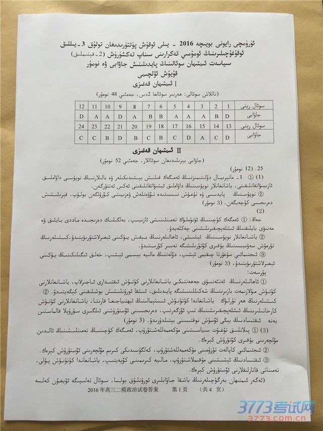 2016乌鲁木齐二模民语系政治试题答案及评分标准