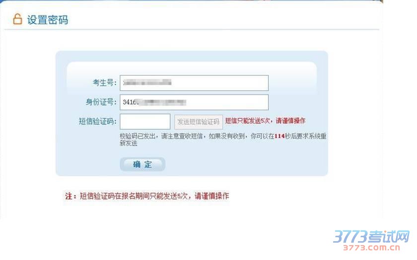 输入考生号,身份证号,点击“发送短信验证码”按钮后,系统会随机发送6位数字验证码至考生报名时所填的手机号上;填写完短信验证码,点击“确定”,跳转至考生修改密码页面,设置考生登录密码。短信验证码只能发送5次,请考生谨慎操作。
