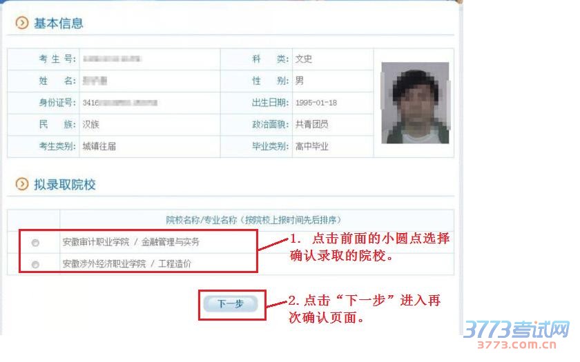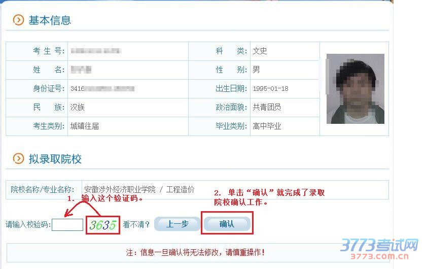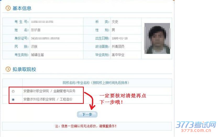 2. 用自己设定的密码重新登录,进入录取院校确认界面: