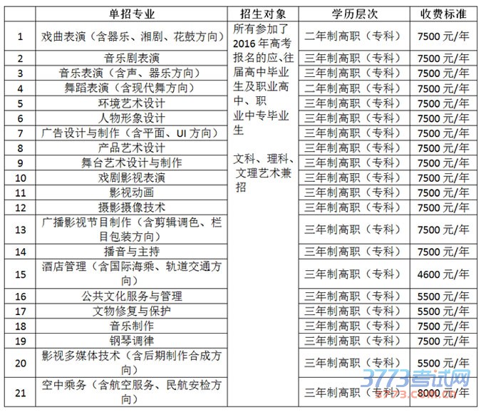 单独招生计划为780名,招生专业为戏曲表演、音乐剧表演、音乐表演(含声、器乐方向)、舞蹈表演、环境艺术设计、人物形象设计、广告设计与制作、产品艺术设计、舞台艺术设计与制作、戏剧影视表演、影视动画、摄影摄像技术、广播影视节目制作、播音与主持、酒店管理、公共文化服务与管理、文物修复与保护、音乐制作、钢琴调律、影视多媒体技术、空中乘务。如单独招生计划未完成,缺额计划转为普通高职计划(面向湖南省内)。