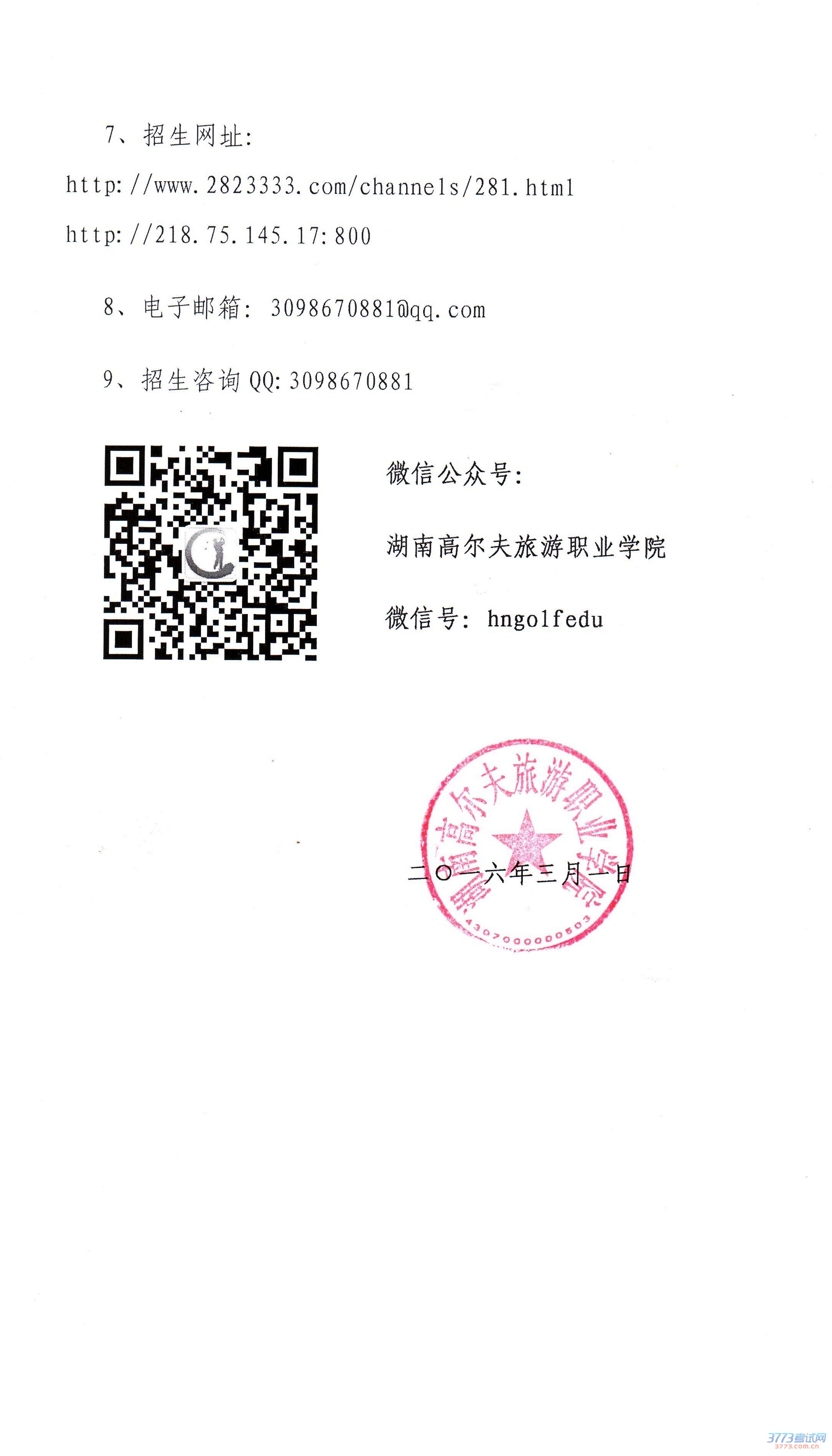 5.具体详情请咨询学院招生热线:0736-2823333或登陆学院网站查询(www.2823333.com)、关注“湖南高尔夫旅游职业学院”微信公众帐号hngolfedu、招生网址:http://www.2823333.com/channels/281.html或http://218.75.145.17:800。