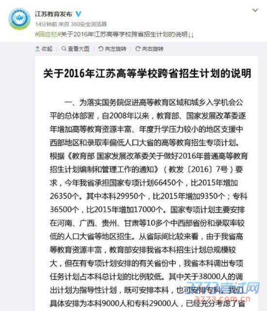 在《说明》中,省教育厅表示,根据《教育部国家发展改革委关于做好2016年普通高等教育招生计划编制和管理工作的通知》(教发【2016】7号)要求,今年我省承担国家专项计划66450个,比2015年增加26350个。其中本科29950个,比2015年增加9350个;专科36500个,比2015年增加17000个。国家专项计划主要安排在河南、广西、贵州、甘肃等10多个中西部省份和录取率较低的人口大省等地区招生。从省际间比较来看,由于我省高等教育资源丰富,教育部安排我省本科招生计划总规模较大,但在有专项计划安排的有关省份中,我省本科调出专项任务计划站本科总计划的比例较低。其中关于38000人的调出计划为指导性计划,既可安排本科,也可安排专科。我们具体安排为本科9000人和专科29000人,已经充分考虑了省内高考考生的本专科录取率不降低的因素。