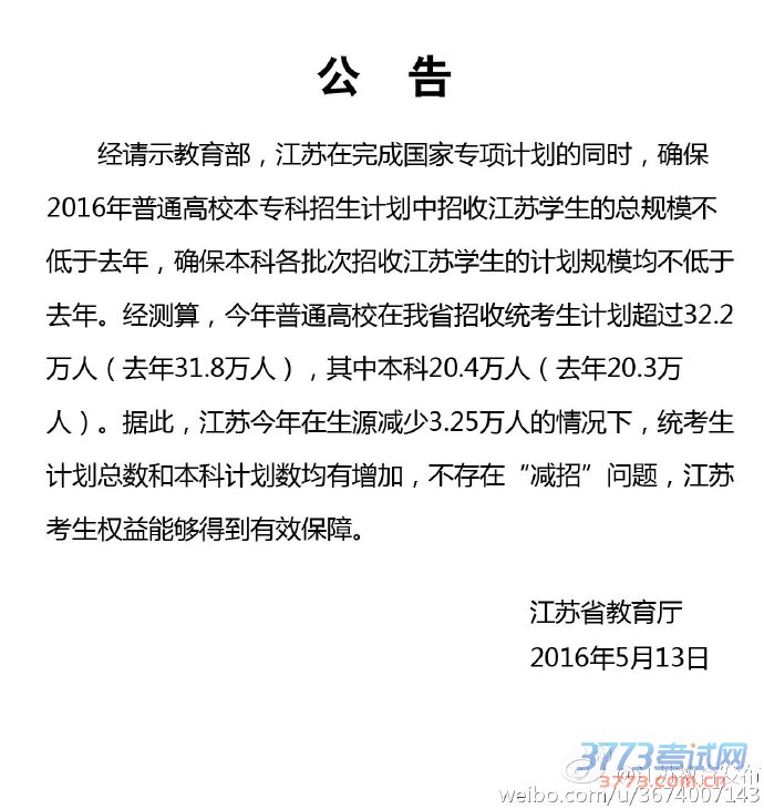 扬子晚报网5月13日讯 江苏省教育厅官方微博@江苏教育发布 13日晚23:50发布微博消息称,经请示教育部,江苏在完成国家专项计划的同时,确保2016年普通高校本专科招生计划中招收江苏学生的总规模不低于去年,确保本科各批次招收江苏学生的计划规模均不低于去年。经测算,今年普通高校在我省招收统考生计划超过32.2万人(去年31.8万人),其中本科20.4万人(去年20.3万人)。据此,江苏今年在生源减少3.25万人的情况下,统考生计划总数和本科计划数均有增加,不存在“减招”问题,江苏考生权益能够得到有效保障。