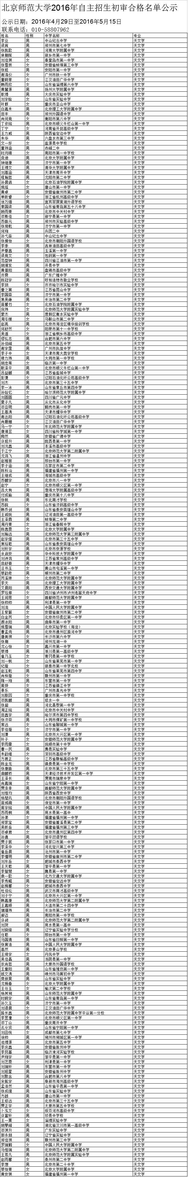 2016年自主招生初审合格名单公示