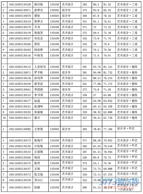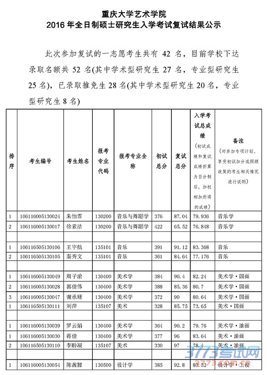 2016年重庆大学艺术学院硕士研究生复试结果公示