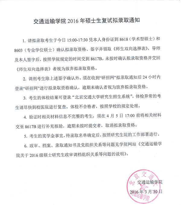 北京交通大学交通运输学院2016年拟录取通知及名单公示