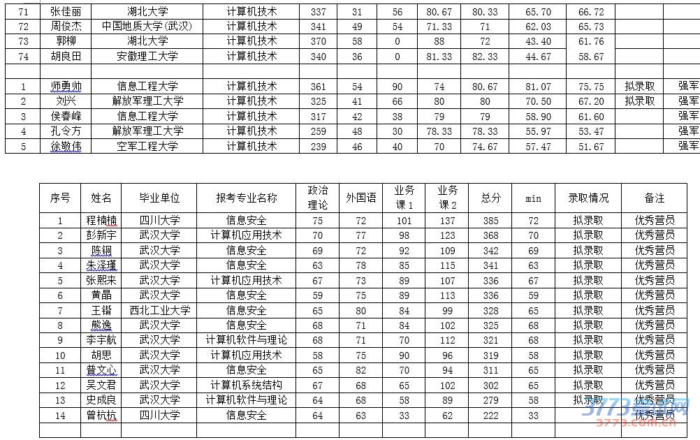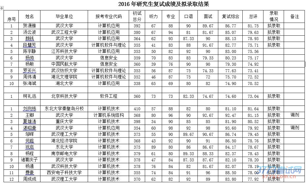 2016年武汉大学计算机学院硕士研究生复试成绩公示