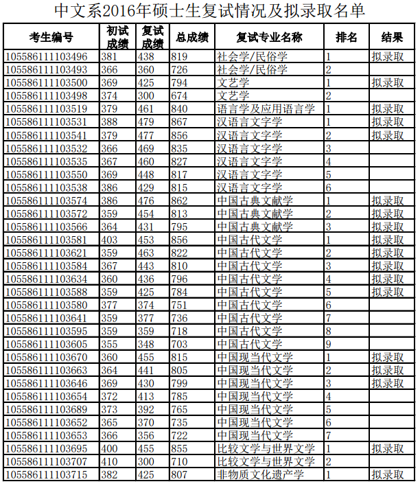 中山大学中文系2016年硕士生复试情况及拟录取名单