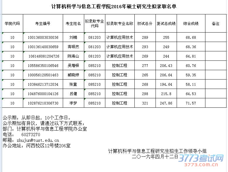 2016年天津科技大学计算机科学与信息工程学院拟录取名单