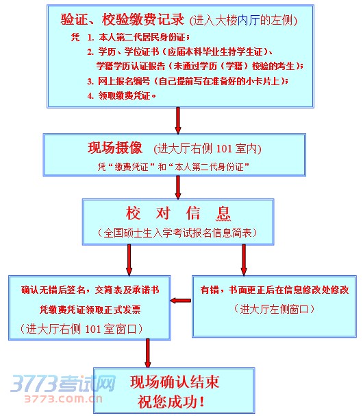 2)报名考试点只对考生有效身份证件(军人未办理二代身份证须填写:《未办理身份证军人报考硕士研究生证明表》)、学历和学位证进行核对。考生报考资格的审查首先由考生根据报考条件的要求,自行进行报考资格审查,然后再由招生单位在复试时进行审查。请网上报名成功的各类考生按以下要求进行现场报名信息确认。
