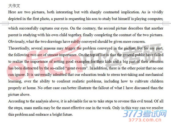 As is vividly depicted in the first picture there is a father watching TV and asking his son to study hard, with his son being unable to concentrate on his study. The second picture portrays that the son and the father are studying hard together. At the lower part of the picture is a caption which implies that it is wise for parents to set a good example for their children by action rather than by words.