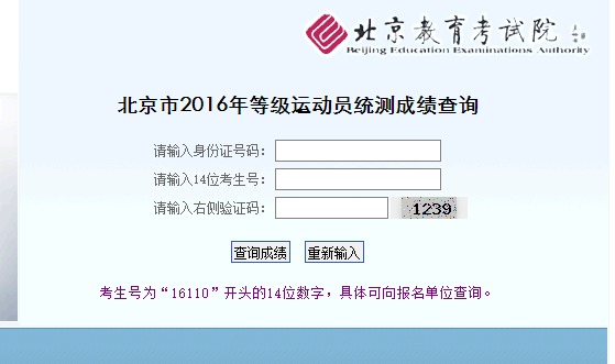 北京市2016年等级运动员统测成绩查询 请输入身份证号码: 请输入14位考生号: 请输入右侧验证码: 考生号为“16110”开头的14位数字,具体可向报名单位查询。