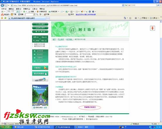 第一步:登录农行网上银行网站(http://www.95599.cn) (见图一),在左侧选择“电子支付卡介绍”,进入“电子支付卡介绍”页面。