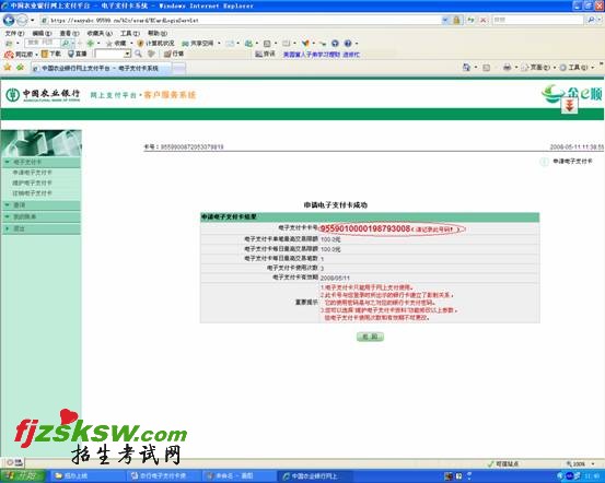 弟六步:生成电子支付卡卡号(见图六),请记住电子支付卡卡号及其它信息,电子支付卡申请成功。如果遗忘电子支付卡卡号,可以在“电子支付卡系统”页面(见图四)中的查询功能中查询。
