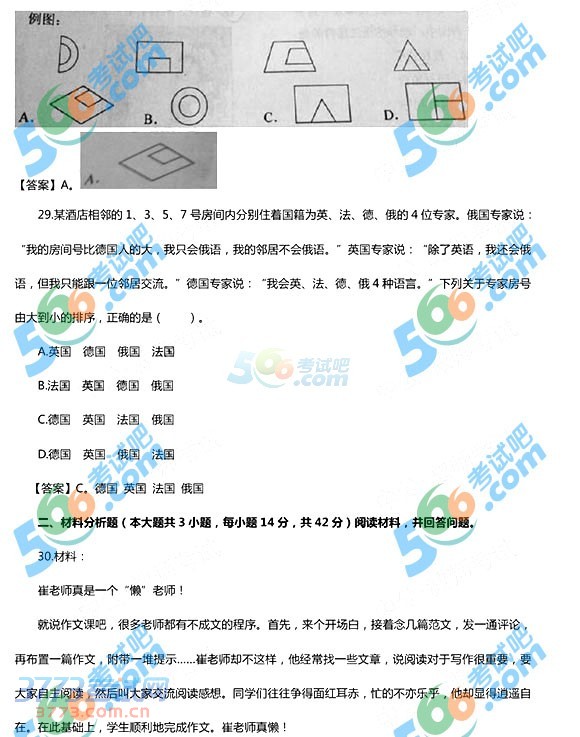 2014下半年中小学教师资格小学综合素质真题及答案
