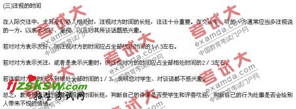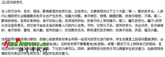 (4)盯视,即目不转睛,长时间地凝视某人的某一部位。师生在交谈中,应注视对方的眼睛或脸部,以示尊重别人,但是,当双方缄默无语时,就不要再一直看着对方的脸。因为双方无话题时,本来就有一种冷漠、踌躇不安的感觉。如果此时您注视学生,势必使对方显得更尴尬。