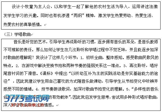 本课教学中我以小牧童在农村的生活为主线,组织教学环节进行情境铺垫,接下来的“听” 、“拍” 、“唱” 、“赏”等各个环节我注重知识的逐层深入,从易到难。首先是“听”牧童最喜欢的歌,整体感知音乐情绪。重难点的“拍”也是在生动的师生游戏、律动等多种形式的体验中得以解决的,其中“唱”的几个环节运用了灵活多样的教学方法,内容层层递进,使学生既学会了歌曲又感受到歌曲快乐的情绪;其次是“赏”牧童带来的乐曲,运用了讲述法和启发思维法激发学生展开想象,描述牧童在农村快乐惬意的生活,用自己喜欢的方式进一步感受音乐表达的情绪;最后布置作业的部分也是让学生在其他形式的作品中找找牧童快乐的农村生活,进行拓展的同时又为下节课做好铺垫。