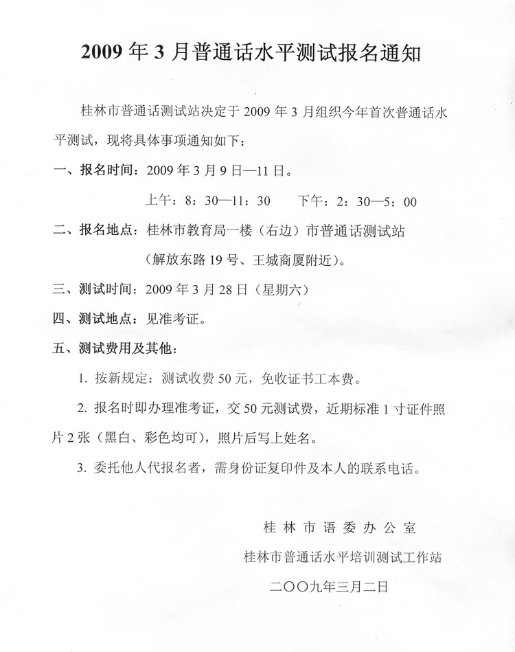 三明市教育局2009年上半年普通话水平测试报名的通知